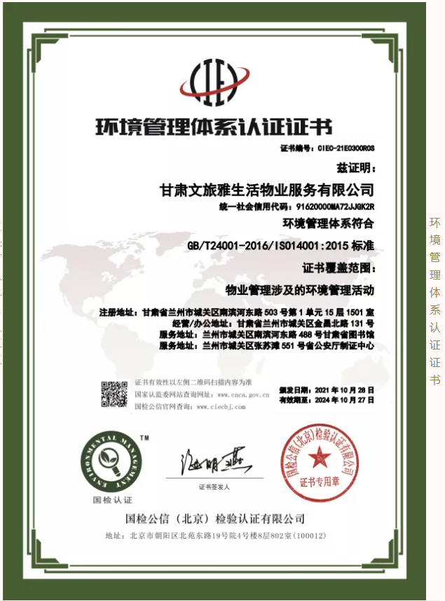 2021年,甘肅文旅雅生活物業服務有限公司認真貫徹落實習近平新時代中國特色社會主義思想,堅決落實集團公司各項決策部署。按照集團公司高質量發展要求,結合自身發展需要,公司于9月份正式啟動3A體系認證工作,經過權威認證機構對公司信用管理、制度建設、管理體系等方面綜合評估,10月底公司順利通過3A體系認證,使得公司在管理水平、制度建設方面有了進一步完善及提升,增強了公司核心競爭力和品牌影響力,為公司高質量發展奠定了堅實的基礎。