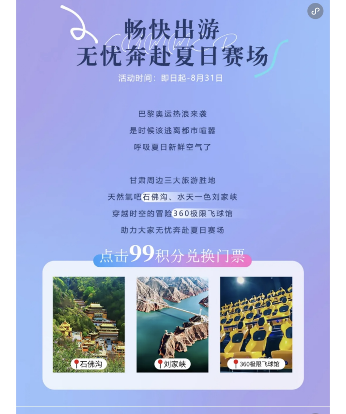 首期活動,運營集團精選蘭州石佛溝國家森林公園(國家AAAA級旅游景區(qū))、劉家峽恐龍國家地質公園(國家AAAA級旅游景區(qū))及蘭山360極限飛球三家景區(qū)場館參與活動。期間,吾悅廣場室內外大屏也將滾動播放景區(qū)場館的宣傳影片,供廣大消費者了解景區(qū)場館詳細信息。后續(xù),運營集團將根據(jù)市場反饋與實際情況,不斷調整、更新活動場館,為廣大消費者帶來更加豐富多元、新鮮有趣的旅游體驗。